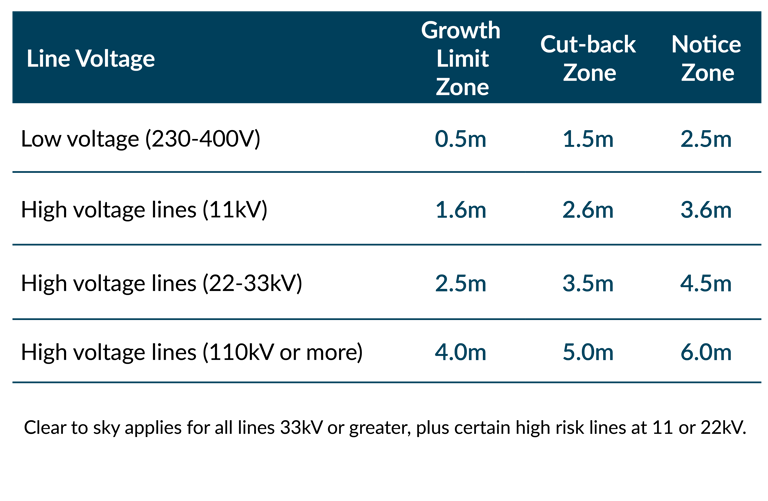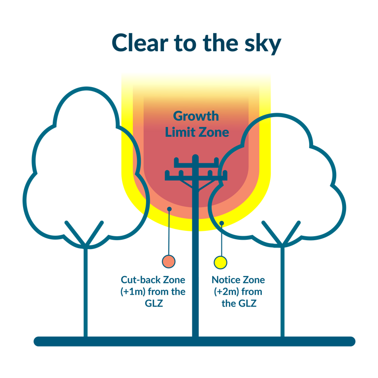 There are three zones: the (hazard warning) Notice Zone, Cut-back Zone and Growth Limit Zone (GLZ)* with different clearance distances depending on the power line voltage.